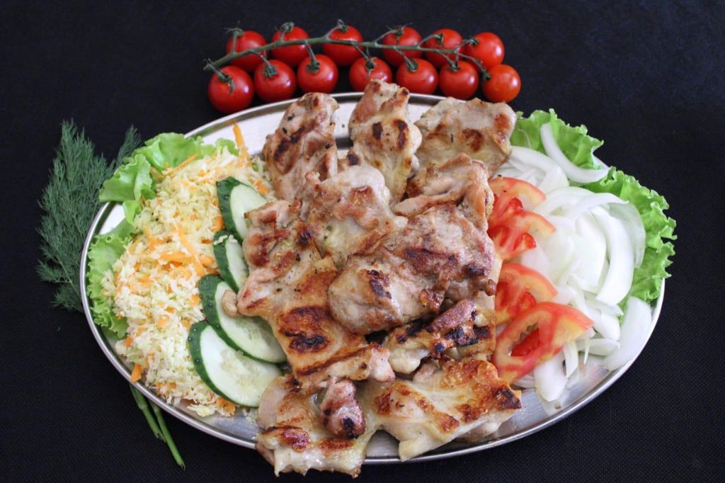 Из куриного окорочка удалили все кости, замариновали разделили на несколько кусочков и поджарили на гриле.